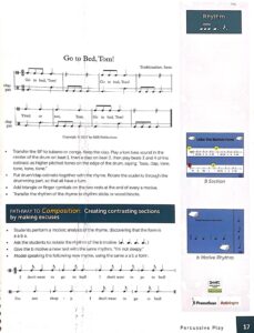 Percussive Play, by Roger Sams and Michael Vasquez is a supplemental resource that  includes ten brimming lessons using only unpitched percussion instruments.  They focus on rhythmic skill development and can be easily adaptable to a wide range of grade levels.