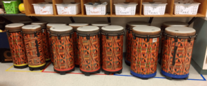 The World Music Drumming is a fantastic resource, and we are lucky enough to have acquired a lot of drums over the past few years to bring these possibilities to life. I store these drums on the side of the room under the recorders. I use the same colored floor tape around the bottoms of the drums to help the students see a color-coded difference in the drums, and to help them put them away in the correct area marked by a floor tape square. These colors are also helpful in projected visuals of large drums = blue, medium drums = red, and small drums = yellow.
