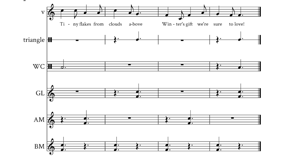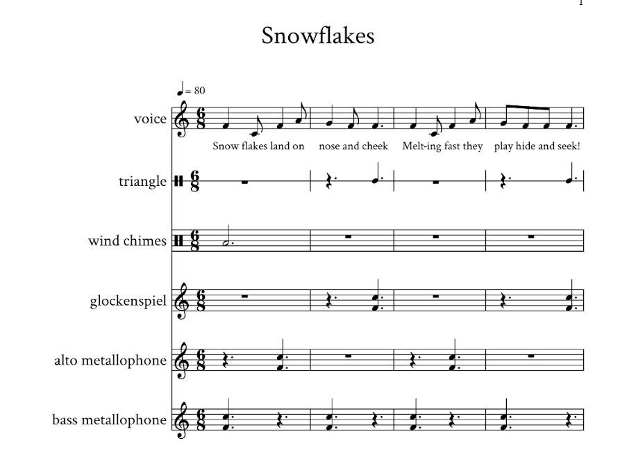 - Transfer to un-pitched percussion, being thoughtful of instrument choices (maybe finger cymbals, triangles, claves, etc.)