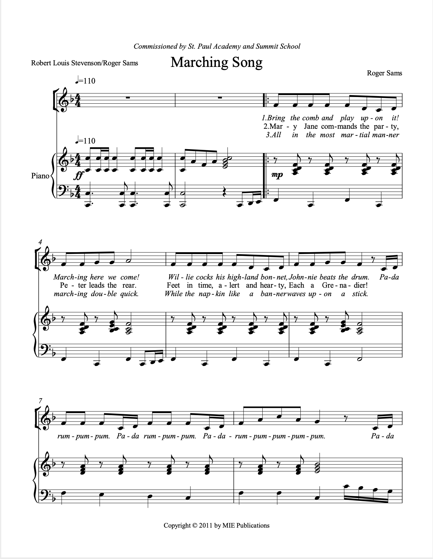 #CRCP2 Volume 2: ìMarching Songî is the second installment in the Robert Louis Stevenson Song Cycle, by Roger Sams. This lively three-part treble arrangement is both fun to sing and loaded with clear teaching opportunities. The melody for the verses is pentatonic, with an emphasis on Low Sol and Low La (below the Do tonal center). The chorus offers three mock instrument parts, each with their own melodic identities. Put them all together and youíve got young singers singing in three-part harmony with joy and ease.