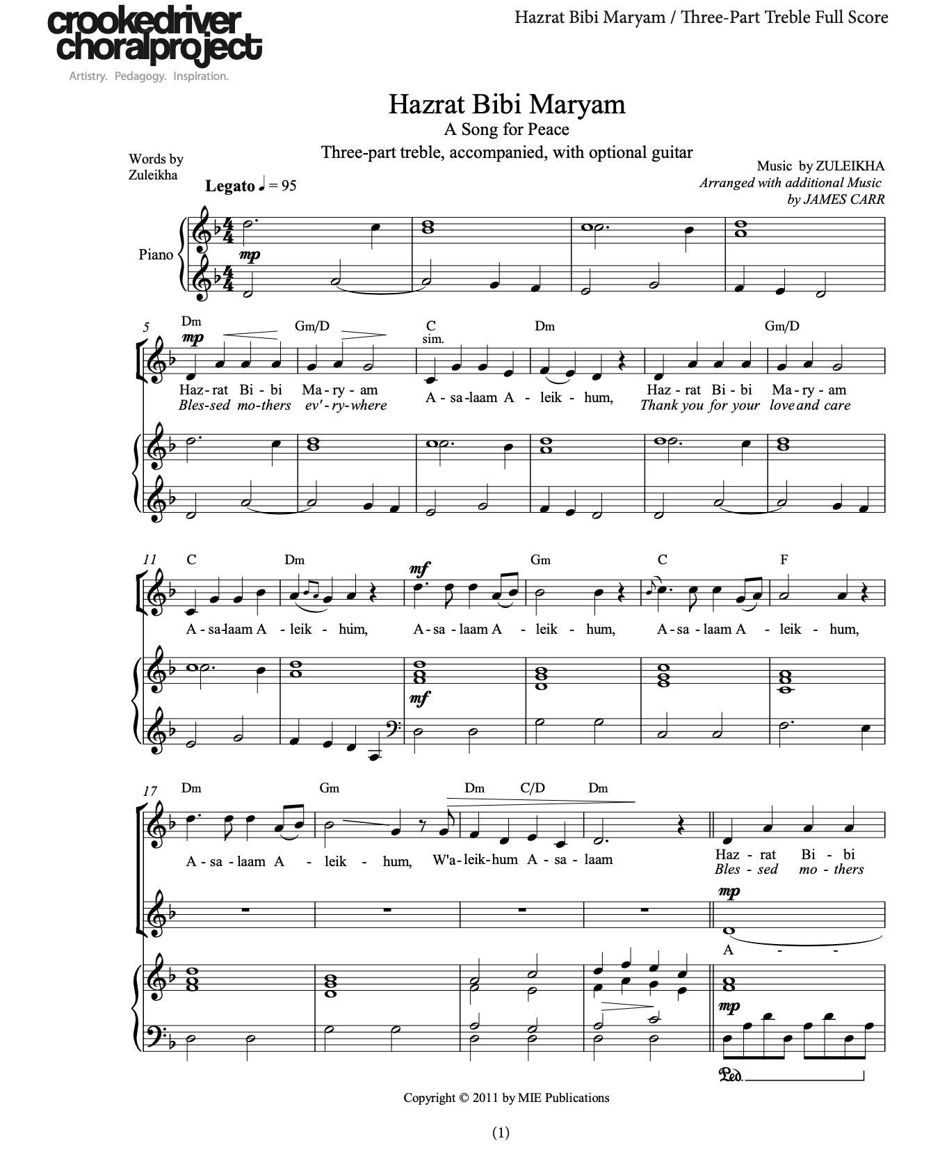#CRCP4 Volume 4: ìHazrat Bibi Maryam: A Song for Peace" by Zuleikha is a simple song. Using Arabic text, it praises Mary, Mother of Jesus, as a doorway for remembering all the mothers on the earth, those who came before and those who will come after. The refrain means ìPeace be with you.î This song came as an inspiration for greater love and harmony in the world. An alternative English/Arabic text is offered for environments where the text about Mary may be considered inappropriate. This alternative text honors mothers everywhere.