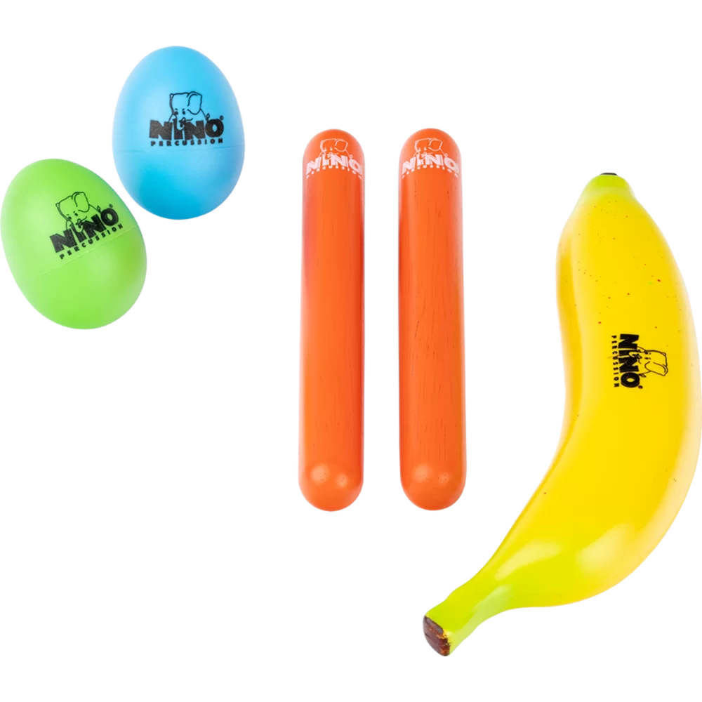 • Includes: 2 Egg Shakers, 1 Banana Shaker, Wood Claves