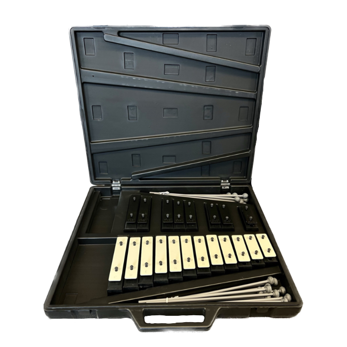 Alloy steel bars mounted on durable plastic resonator boxes. Each set includes plush lined case and mallet for each bar.